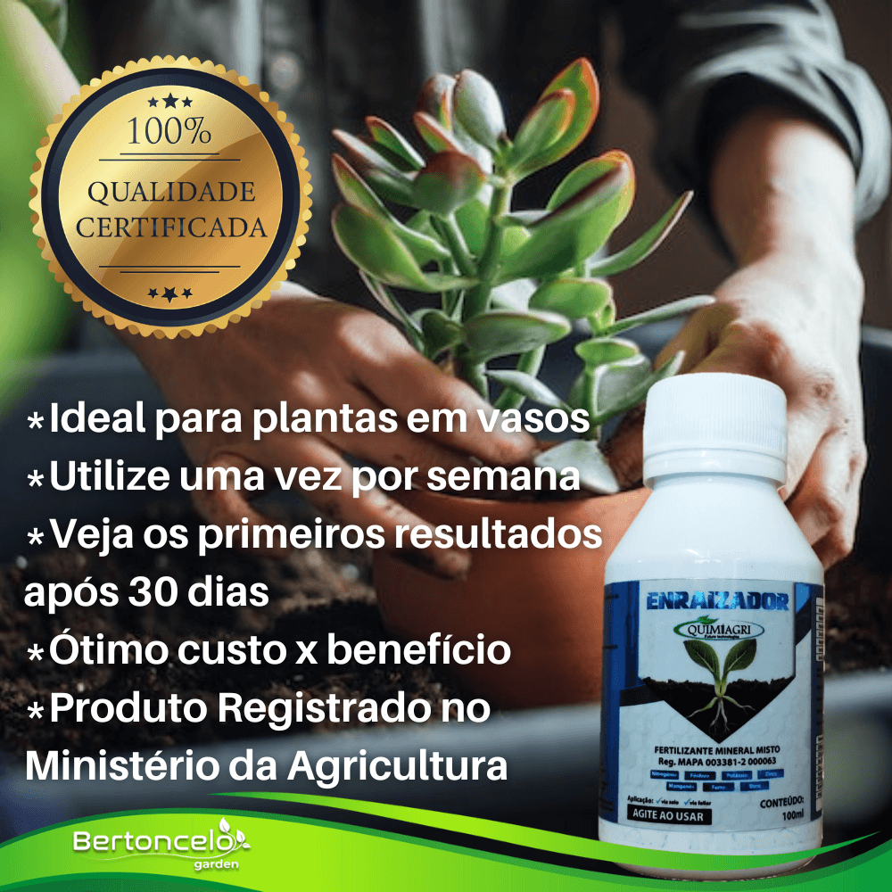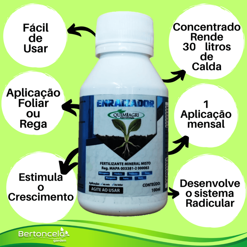 Enraizador Forte é um fertilizante (Profissional e Concentrado) desenvolvido para auxiliar o desenvolvimento do sistema radicular das plantas, aumentando seu desenvolvimento e produtividade.