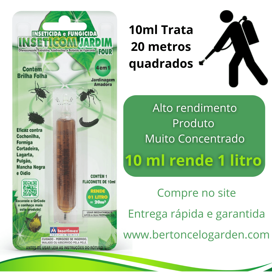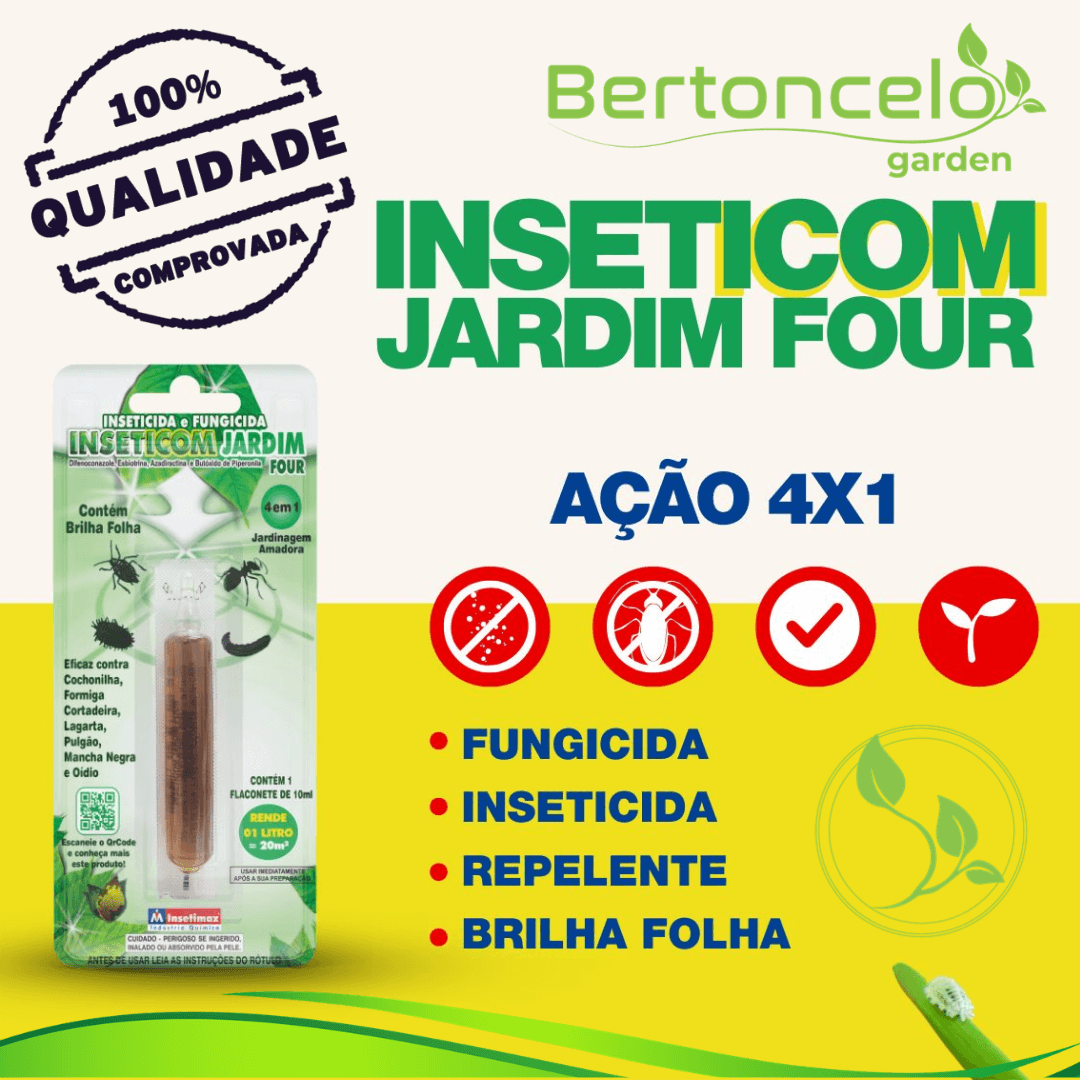INSETICOM JARDIM FOUR é um inseticida e fungicida, elaborado com Difenoconazole, Esbiotrina, Azadiractina e Butóxido de Piperonila,  eficaz para a proteção das plantas do seu jardim contra a manifestação de Pulgão (Aphis gossypii), Cochonilha (Orthezia praelonga), Lagarta (Brassolis sp), Formiga (Atta sexdens), Mancha negra (Diplocarpon rosae)e Oídio (Sphaerotheca pannosa).