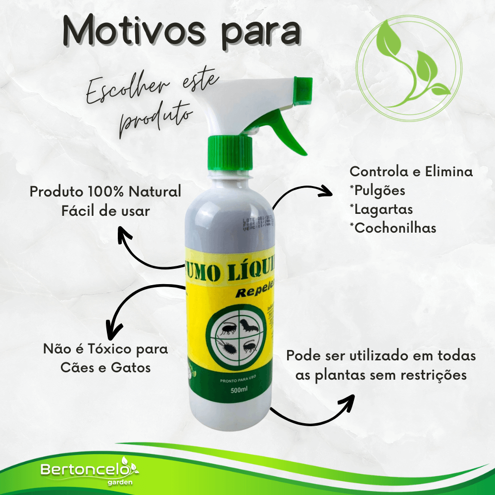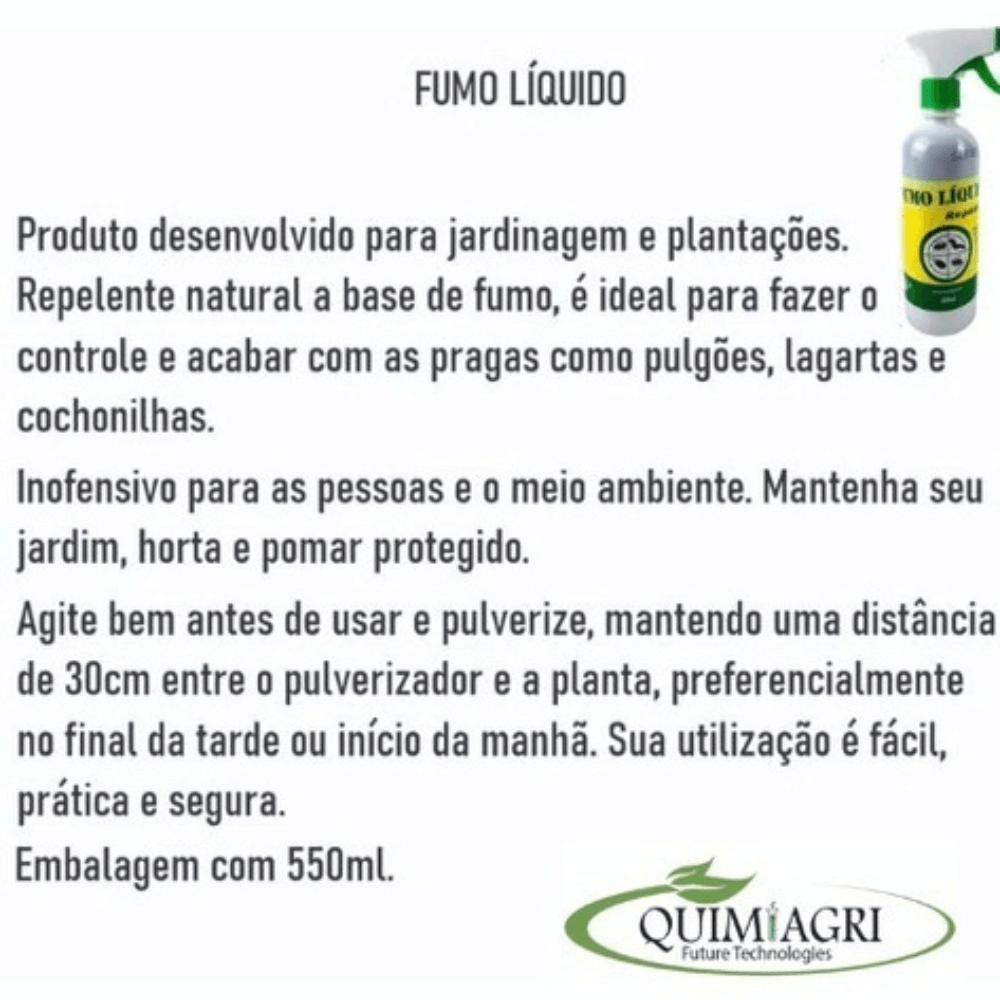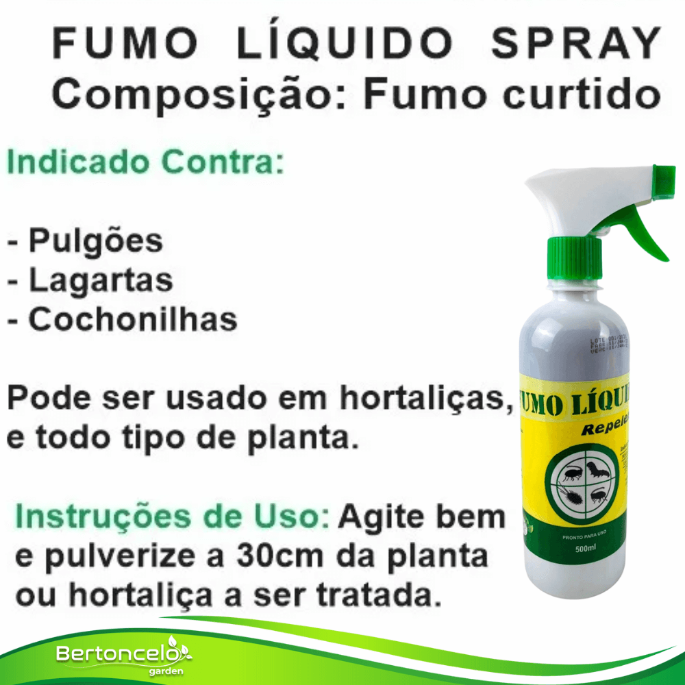 Antes de aplicar, agite bem a embalagem do produto. Pulverize o Repelente Fumo Líquido, uniformemente por toda a planta infestada mantendo a distância de 30cm entre o bico do pulverizador e a planta. Faça no início da manhã ou no final da tarde. Para combater as pragas, aplique uma vez por semana até a eliminação das pragas. Para prevenção, recomenda-se aplicar a cada 20 dias.