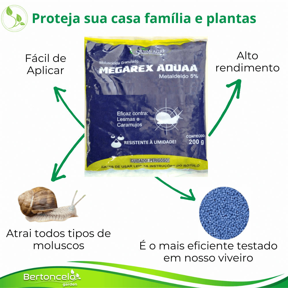 Instruções de Uso: Aplicar 10g de MEGAREX AQUAA por m2, diretamente da embalagem ou com o auxílio de um aplicador, espalhando as iscas diretamente sobre o solo, entre as plantas, nas áreas infestadas pelas lemas e caramujos. Se necessário, após 7 dias, reaplique o produto.