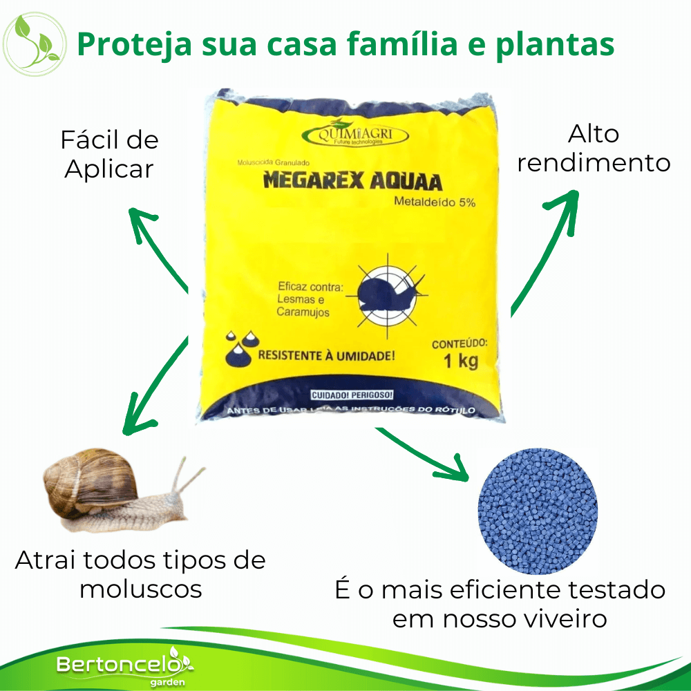 Instruções de Uso: Aplicar 10g de MEGAREX AQUAA por m2, diretamente da embalagem ou com o auxílio de um aplicador, espalhando as iscas diretamente sobre o solo, entre as plantas, nas áreas infestadas pelas lemas e caramujos. Se necessário, após 7 dias, reaplique o produto.