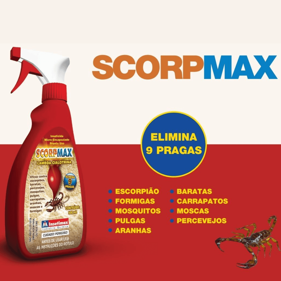 O Inseticida SCORPMAX pode ser usado em áreas internas e externas. Basta agitar bem o frasco, colocar o bico