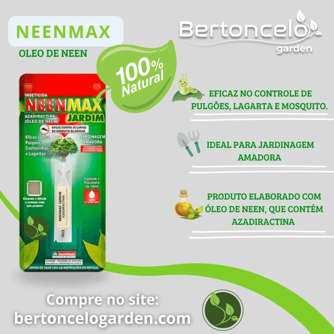Ideal para Jardinagem residencial, é um produto elaborado com óleo de Neem, que contém Azadiractina, eficaz no controle de Pulgões, lagarta, mosquito (aedes aegypti) e cochonilhas em jardins.