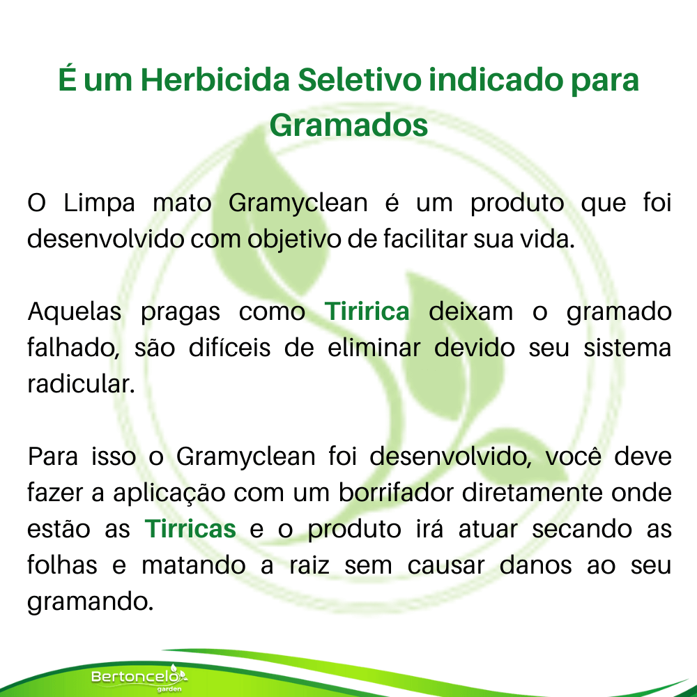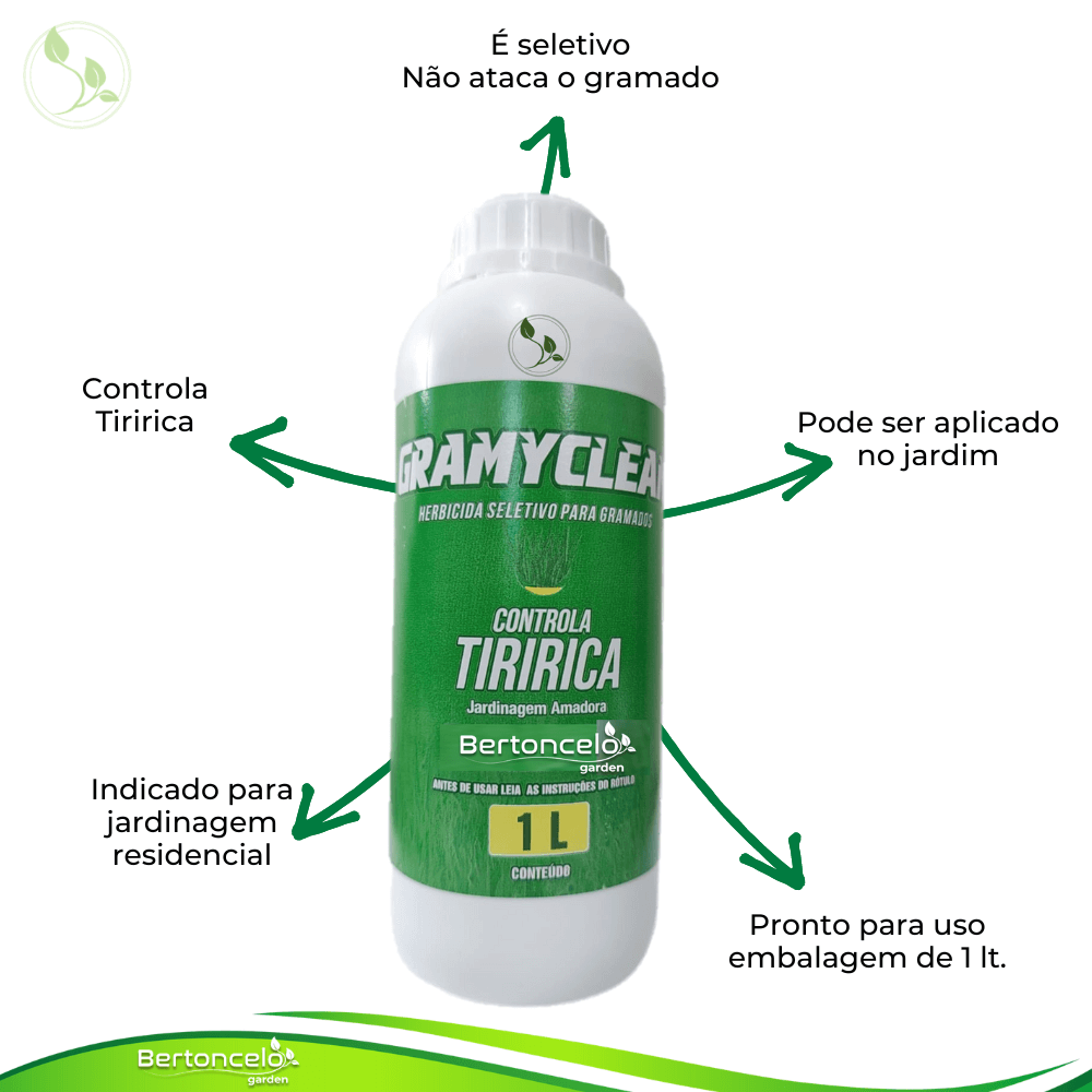 Produto pronto uso seletivo, podendo ser aplicado sobre gramado. Altamente eficaz no controle das ervas daninhas Tiririca ( Cyperus rotundus ), Picão Preto ( Bidens pilosa) e Picão Branco (Galinsoga parviflora)/