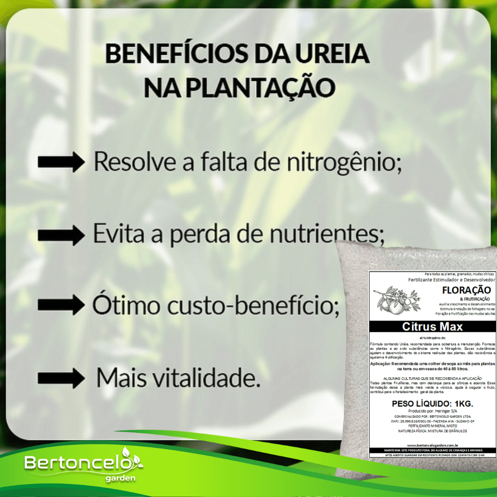 Algumas das consequências da falta de nitrogênio no solo são: Amarelecimento das folhas, diminuição do crescimento da parte aérea e das raízes, diminuição do tamanho das frutas e redução da produção. A ureia é um fertilizante que atua como fonte de nitrogênio. A sua utilização possibilita a complementação da quantidade necessária desse elemento no solo, para que se obtenha melhor produtividade das culturas.
