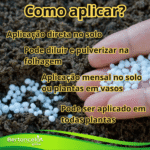 Quanto aplicar: De 50 à 100 gr. ou uma colher de sopa. A quantidade à ser aplicada dependerá de onde a planta está, em um vaso pequeno por exemplo, utilizar uma colher, já quando a planta estiver no solo utilizar até 100gr. por aplicação;