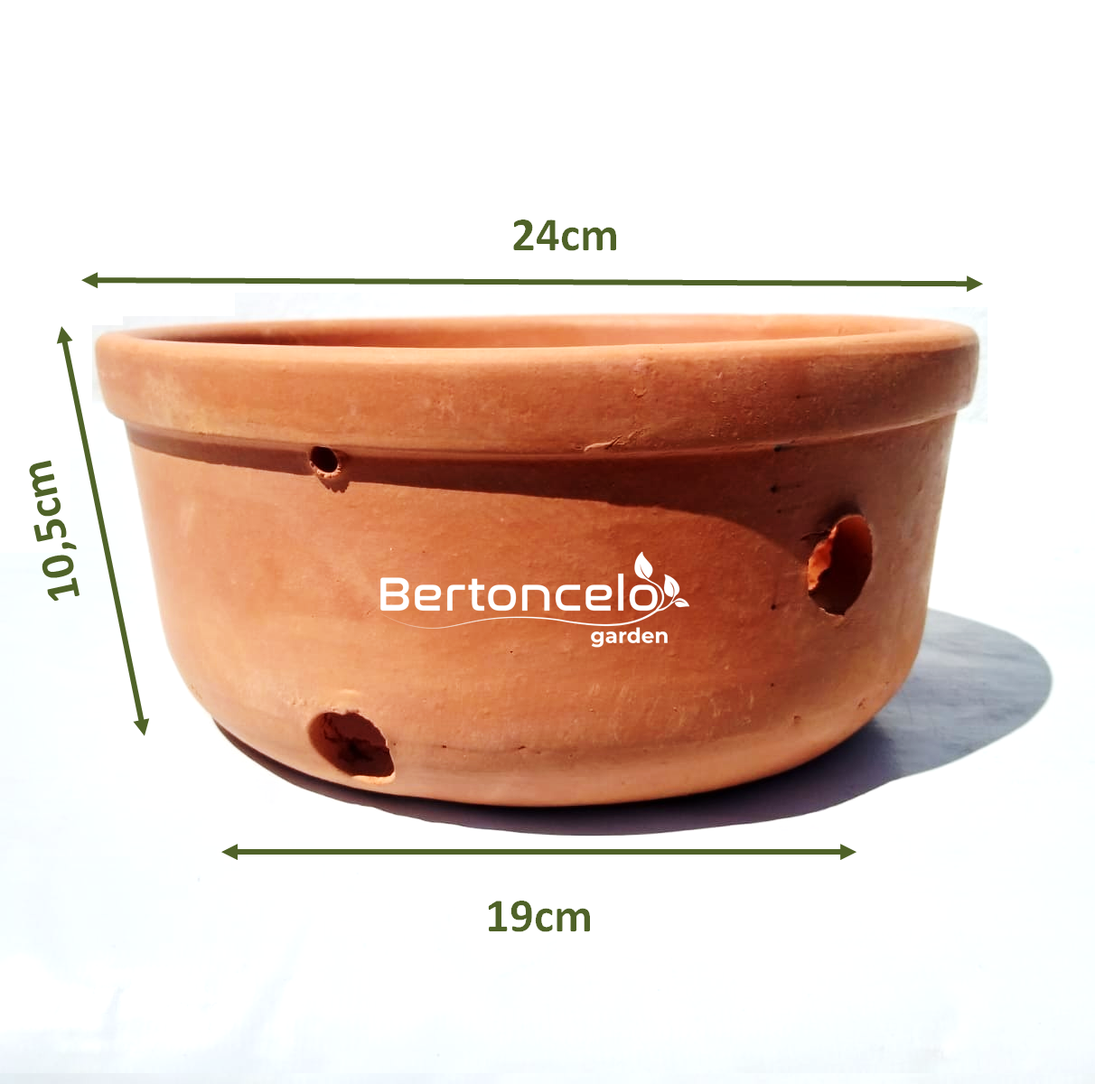 Possui furos (maiores) nas laterais e fundo para drenagem da agua;
